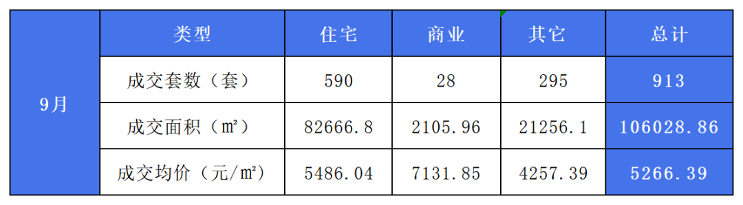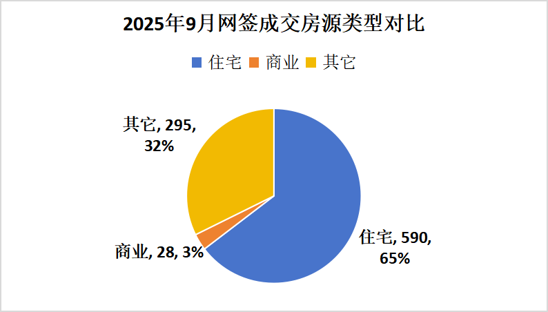 在2025年9月成交的913套房源中,其中住宅房源590套,占总成交房源的65%,住宅均价为5486.04元/㎡;商业房源28套,占总成交房源的3%,商业均价为7131.85元/㎡;其他房源295套,占总成交房源32%,其他房源均价4257.39元/㎡。