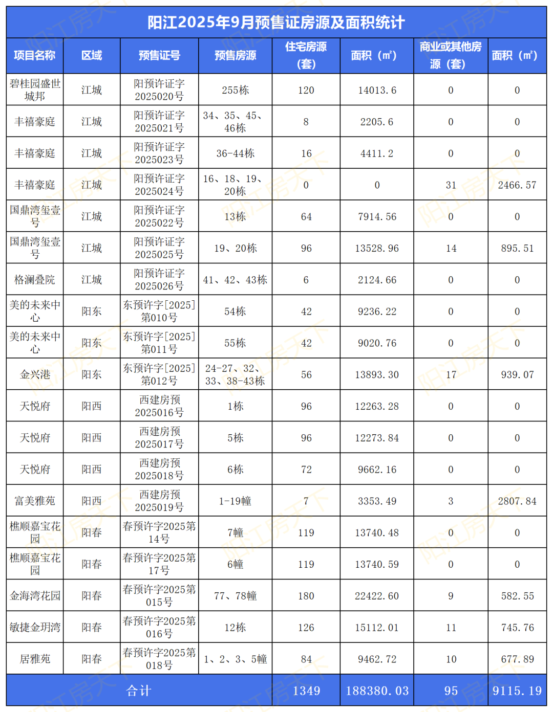 2025年9月阳江颁布19张预售证,共1444套房源入市,新增总面积约19.74万㎡,具体内容如下表:
