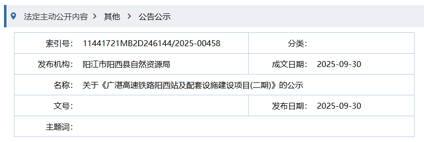 近日,《广湛高速铁路阳西站及配套设施建设项目(二期)》规划已由阳西县自然资源局正式公示。