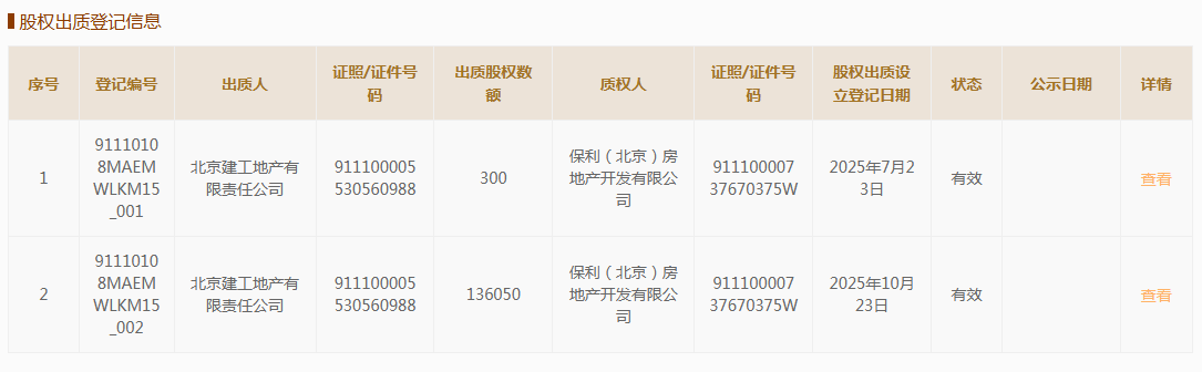 根据国家企业信用信息公示系统最新信息,此次出质的股权数额结合此前已出质的300股股权,北京建工地产有限公司已将其持有的总计136350股股权份额出质予保利(北京)房地产开发有限公司。