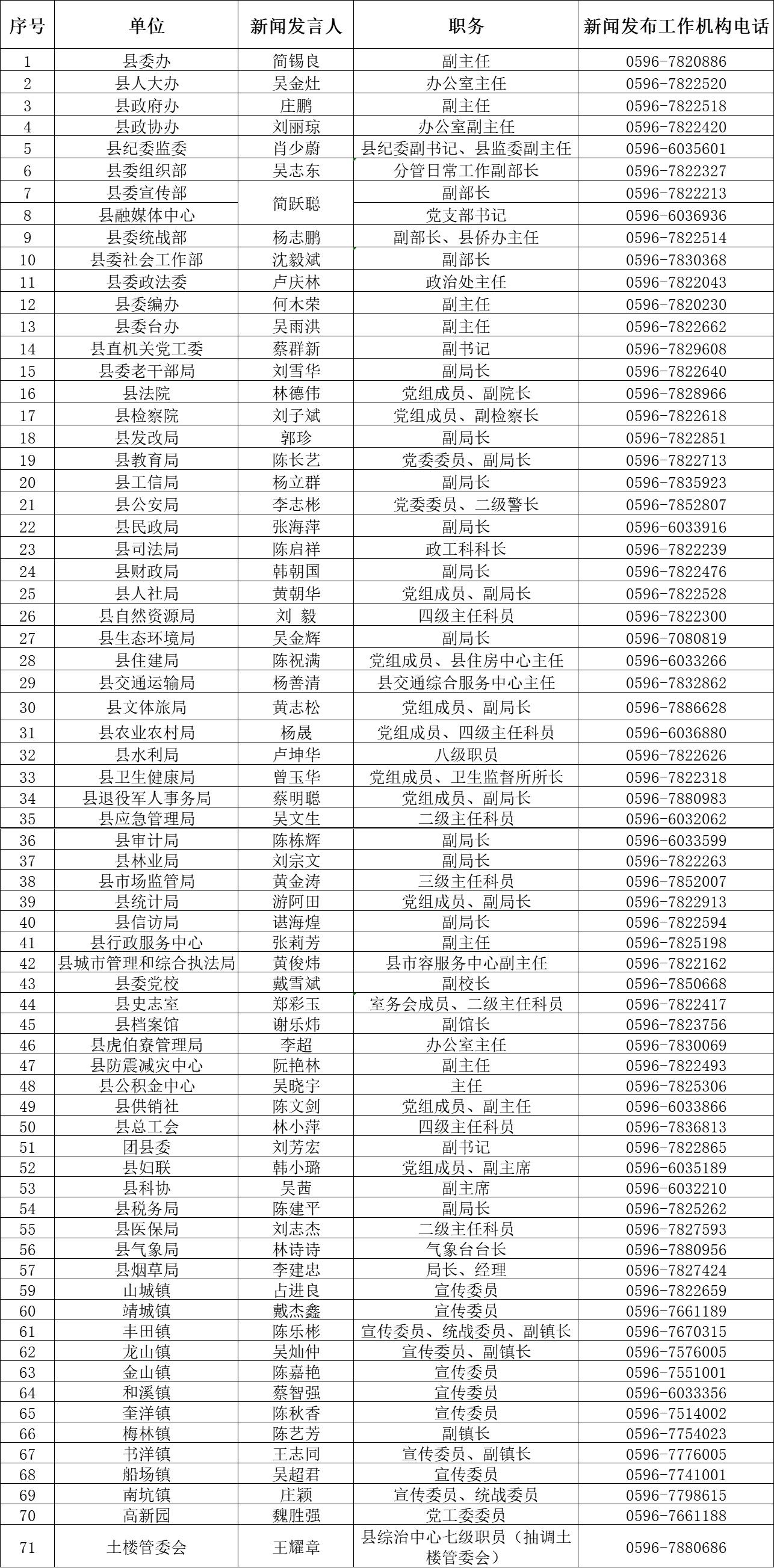 为进一步加强南靖县新闻发言人队伍建设,县政府新闻办对全县新闻发言人登记备案,更新全县新闻发言人信息。现予以公布——