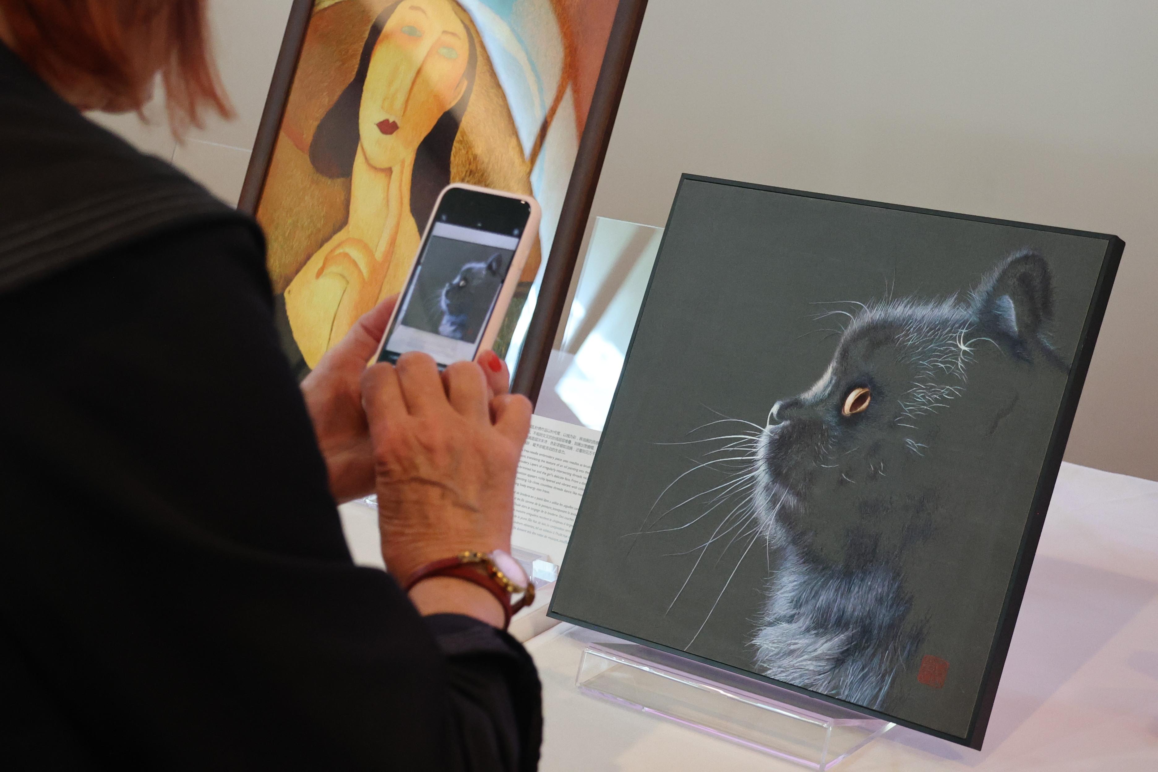 2025年9月4日,观众在法国巴黎中国文化中心参观《一针不多一针不少的苏绣》主题展时拍照留念。新华社记者 张百慧 摄