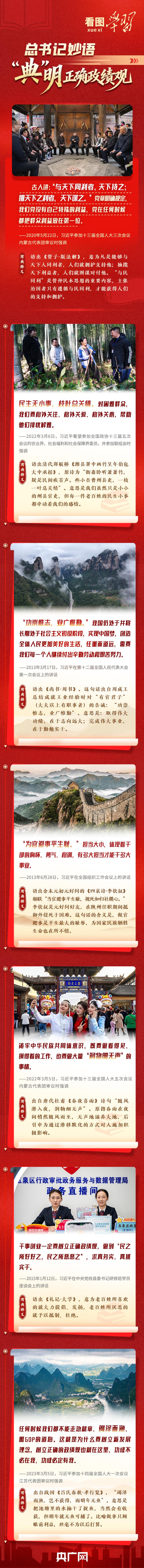 从殷殷嘱托“民生无小事,枝叶总关情”“功崇惟志,业广惟勤”,到悉心叮嘱要做好“润物细无声”的“潜绩”,再到严肃指出任何时候都不能走急就章、竭泽而渔……总书记曾多次引经据典、援古论今,深刻阐释什么是正确政绩观、怎样践行正确政绩观,意蕴深远,发人深省。